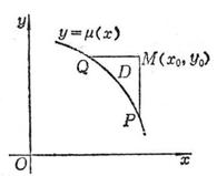 Suppose M ( x 0 , y 0 ) is not a point on y= ( x ) , and draw a characteristic line x=x 0 , y=y 0 through point M and intersect y= ( x ) at P and Q , denote a curved triangle PMQ is D (Fig. 14.6 ), using Green's formula (this section, IV) on D to get