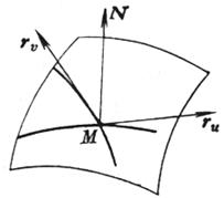 [ Gauss's formula and Eingelden's formula ] Let the parametric equation of the surface be, take three non-coplanar vectors at each point M on the surface, and the trihedron composed of these three vectors is called the movable frame or the companion of the surface. Trihedral; note that here and are not perpendicular to each other, but they are both on the tangent plane and perpendicular to the normal unit vector N .![]()