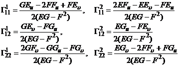 where E , F , G and L , M , N are the first and second fundamental quantities of the surface, respectively; the six coefficients are called the Christopher notation of the second kind of the first fundamental quadratic form, and their expressions are equations The group ( 1 ) is called the partial differential equation of the surface, also known as the Gauss formula; the equation group ( 2 ) is called the External Ingledon formula; ( 1 ), ( 2 ) are collectively called the basic formula of the surface, the characteristics of these formulas Yes, the derivative of a vector is expressed as a linear combination of the vector itself, and its coefficient is only related to the first and second fundamental quantities of the surface .![]()