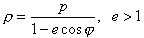 (极坐标方程.极点位于一焦点上,极轴为从焦点背向顶点的射线,p, e如前述.由此方程只能确定一支,另一支可由对称性而得到)