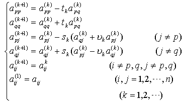 因为在这种旋转变换下,消去了矩阵中位于第p行第q(p¹ q)交点上的元素(见本节,五),而矩阵所有元素的平方和保持不变,而且对角线上的元素的平方和增大,因而非对角线元素的平方和随之减小,因此,当旋转次数足够大时,可使非对角线元素的绝对值足够小.对于预先给定的精度e >0,如果|aij<e (i¹ j),则可认为aij0.于是得到求矩阵A的特征值与特征矢量的具体迭代方法.