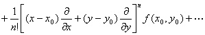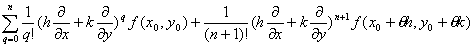 [泰勒公式] 假定在某一点(x0,y0)的邻域D内二元函数f(x,y)有直到n+1阶为止的一切连续偏导数.分别给x及y以改变量h及k,使连结点(x0,y0)及(x0+h,y0+k)的直线段不越出D外,那末f (x,y)在D内可表成形式: