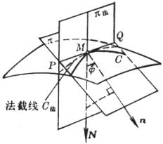 ),它在点M的切线为PQ,曲线C的法线单位矢量为n,通过直线PQ和曲面的法线单位矢量N作意平面