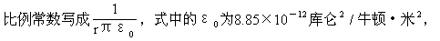 式中F的单位是牛顿,Q的单位是库仑,r的单位是米,这时比例系数K等于9×109牛顿·米2/库仑2。为了简化电学中许多常用公式,往往将