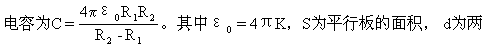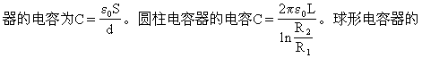 平行板之间的距离, L为圆柱电容器的长度,R1和R2是圆柱和球的内外径。在电容器的两个导体之间充入电介质可以使电容增大。实用中常利用这个方法增大电容器的电容。充入均匀介质后,上述的三种形式的电容都要乘以一个大于1的常数ε(由电介质的性质决定),即电容增至ε倍。
