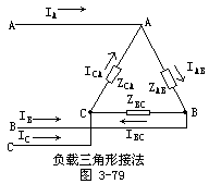 【负载的三角形接法】 图3-79所示为负载三角形接法的连接图。因为每相负载接于两根端线(相线)之间,所以负载的相电压就等于电源的线电压,即