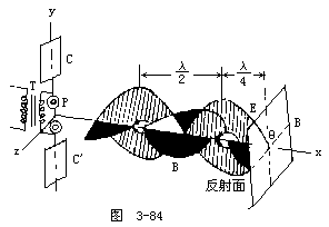 【赫兹振荡器】 赫兹振荡器如图3-84中左端所示,变压器T使金属板C与C′充电,这对金属板经由空隙P放电,空隙便成为偶极振荡器。电磁波沿PX方向传播,电场矢量将平行于Y轴,磁场矢量则平行Z轴。为了接收电磁波,赫兹利用一短导线,作成圆形,并留一小空隙;此项设计称为共振器。用在这类实验上的共振器直径必须比波长小,若放置一共振器,使其面与波的磁场垂直,变化的磁场在共振器中感应一电动势,结果在共振器空隙间产生火花。如果共振器之平面平行于磁场,则不能感应电动势,因此在空隙中无火花。欲产生电磁驻波,赫兹置一反射面(由良导体制成)于Q,在这样的情况下,当共振器位于磁场之节点上时,无论其方向如何,将表现有无感应电动势(或火花)。然而在磁场的反节点上,当共振器垂直磁场时火花最大。沿直线PQ移动共振器,赫兹发现节点与反节点之位置及磁场方向。借量度两相邻节点间距离,赫兹能计算波长λ,因已知振荡器之频率,利用方程式c=λγ,能计算出电磁波之速度。由此方法,赫兹为电磁波传播速度求得第一个实验值。