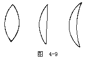 【凹透镜】 两侧面均为球面或一侧是球面另一侧是平面的透明体,中间部分较薄,称为四透镜。分为双凹、平凹及凸凹透镜三种,如图4-11a所示之A、B、C。其两面曲率中心之连线图4-11b所示之G1H,称为主轴,其中央之点O称为光心。通过光心的光线,无论来自何方均不折射。图4-11c表示,平行主轴之光束,照于凹透镜上折射后向四方发散,逆其发散方向的延长线,则均会于与光源同侧之一点F,其折射光线恰如从F点发出,此点称为虚焦点。在透镜两侧各有一个。凹透镜又称为发散透镜。四透镜的焦距,如图4-12所示。是指由焦点到透镜中心的距离。透镜的球面曲率半径越大其焦距越长,如为薄透镜,则其两侧之焦距相等。