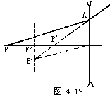 【球面镜成像】 对于凸面镜只能使特成正立、缩小的虚像。如图4-2(a)所示。由物A点出发的平行于光轴的光线,达到镜面后将反射,其反射光的延长线必交球面镜的焦点F上。而从A射向F的光线被球面反射后将平行于光轴。这两条反射线,没有实交点,只有虚交点A′,也就是说视觉认为这两条光线是从A′发出的。物体上的B点发出的沿光轴的光线,即平行于光轴,又过焦点,故B′为B点的像。在物体AB上的各点,接照前述办法作图,其各点的像点都在A′B′上,故A′B′即为AB的像。无论物AB在何处,它所发出的光射到球面镜后而反射的光,没有实交点,因此所成之像必为虚像。由图中可以看出,物体在轴的上方,所成的虚像也在轴的上方,故所成之像为正立。无论AB在什么位置,从A点出发的平行于轴的光线一定在AF方向的光线的上方。此两线的交点A′必比A点更靠近轴,所以像是缩小的。根据上述方法作图可知凹透镜成像可有三种情况:(1)物在凹镜前二倍焦距以外时,是倒立缩小的实像,见图4-2(b)。(2)物在两倍焦距以内,焦点以外时,则成倒立放大的实像,见图4-2(c)。(3)当物位于焦点以内时,则成正立的放大的虚像,见图4-2(c)。