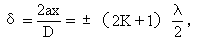 这里K=0相应于在O点处的中央明条纹。K=1,K=2,…等等相应的明条纹分别称为第一级、第二级、…明条纹。如果P点为暗点,按干涉条件,有