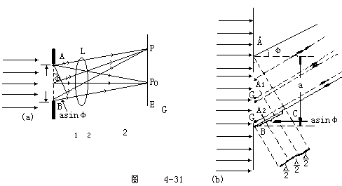 【单缝衍射】单缝衍射的实验装置(夫琅和费单缝衍射)如图4-30所示。光源S放在透镜L1的主焦面上,因此通过透镜L1后的光线是一平行光束。这束平行光照射在很窄的单缝K上,一部分穿过单缝,再经过透镜L2在屏幕E上将出现衍射条纹的像。实验指出,平行光(波阵面和透镜的光轴相垂直)经过透镜后,会聚在焦面中间的光线相互加强而产生亮条纹,这就证明,周相相同的平行光线,经过透镜而被聚焦时,它们的周相仍然是相同的。故可认为透镜的存在不引起附加的周相差。图4-31所示为单缝衍射的说明图。设有宽度为a原单缝,在平行单色光的垂直照射下,位于单缝所在处的波阵面AB上的子波沿各方向传播。衍射角(衍射后的平行光束与入射平行光束所成的角)为j的一束平行光经过透镜后,聚焦在屏幕上P点。这种光线的两条边缘光线之间的光程差为