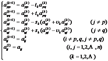Because under this rotation transformation, the elements located at the intersection of the pth row and the qth column ( p 1 q ) in the matrix are eliminated (see this section, five), while the sum of the squares of all the elements of the matrix remains unchanged, and the diagonal The sum of squares of the elements on the line increases, so the sum of squares of the off-diagonal elements decreases. Therefore, when the number of rotations is large enough , the absolute value of the off-diagonal elements can be made small enough . For a given The accuracy of e > 0 , if | a ij | < e ( i 1 j ), then a ij0. Then a specific iterative method for finding the eigenvalues ​​and eigenvectors of matrix A is obtained .