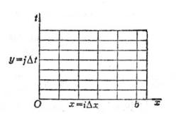 由此可按t增加的方向逐排求解.在第0排上ui0的值由初值(ix)确定,j+1排ui,j+1的值可由第j排的三点(i+1,j),(i,j),(i-1,j)上的值ui+1,j, uij,ui-1,j确定,而u0,j+1,un,j+1已由边界条件1((j+1)t)及2((j+1)t)给定,于是可逐排计算一切节点上的uij值.当(x), 1(x)和2(x)充分光滑,且