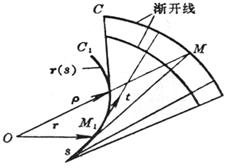 An involute space curve r ( s ) is an involute for its involute, that is, a family of normal envelopes of the involute . A point M 1 of the involute C 1 falls on the axis of curvature of the corresponding point M of C. (The lower figure on the upper page) If this family of normals forms a developable surface, rotate a fixed angle on the normal surface, and the resulting normals still form a developable surface (right) |