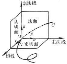 [ Three unit vectors of the active frame ] t is the unit tangent vector, the direction is consistent with the positive direction of the curve; n is the unit principal normal vector, which points to the concave side of the curve; b is the unit secondary normal vector, b = t n . t , n , b form a right-handed system (Fig. 7.18 ) . These three vectors are called the movable frame of the curve at point M (or called the moving scalar trihedron, the adjoint trihedron, also called the movable scalar) .![]()