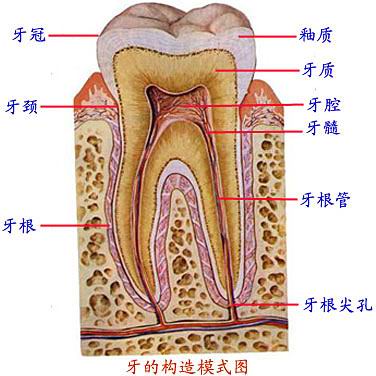 牙的构造包括牙质、牙釉质、粘合质。牙质为主体,牙釉质覆盖于牙冠表面,粘合质也称牙骨质,包在牙根、牙颈周围。