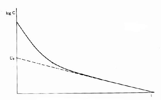 当n=5时,At≈97%A0。这一时间,即5个t1/2不因给药剂量多少而改变。具体数值见表3-2。 药物自体内消除的一个重要指标是血浆清除率(plasmaclearance,Cl),是肝肾等的药物消除率的总和,即单位时间内多少容积血浆中的药物被消除干净,单位用L·h-1(也有人用ml·min-1,和肌酐消除率一致)或按体重计算 L·kg-1·h-1。按定义,CL=RE/Cp,RE是消除速率(rate of elimination),即单位时间内被机体消除的药量,Cp为当时的血浆药物浓度。由于RE非固定值也不易检测,故常用表观分布容积(apparent volume ofdistribution, Vd)计算。 Vd是指静脉注射一定量(A)药物待分布平衡后,按测得的血浆浓度计算该药应占有的血浆容积。事实上静注药物后未待分布平衡已有部分药物自尿排泄及(或)在肝转化而消除,故必需多次检测Cp,作时量曲线图,将稳定下降的消除段向O时延升至和Y轴交点以求得理论上静注药量A在体内分布平衡时的血浆浓度C0,以此算出Vd=A/C0(图3-7)。按RE=keA,Cp=A/Vd,故Cl=keVd。在一级动力学的药物中,Vd及Cl是两个独立的药动学指标,各有其固定的数值,互不影响,也不因剂量大小而改变其数值。Vd是表观数值,不是实际的体液间隔大小。除少数不能透出血管的大分子药物外,多数药物的Vd值均大于血浆容积。与组织亲和力大的脂溶性药物其Vd可能比实际体重的容积还大。Cl也不是药物的实际排泄量。它反映肝和(或)肾功能,在肝和(肾)功能不足时Cl值会下降,因为Cl是肝肾等消除能力的总和。肝清除率虽然难测,但有重要的理论意义。肝清除率小的药物,首关消除少,其口服生物利用度大,但易受肝功能,血浆蛋白结合力及肝药酶诱导或抑制药的影响。肝清除率大的药物,首关消除多,其口服生物利用度小。有些药物的肝清除率很高,接近肝血流量,称为灌流限制性清除,其肝清除率受肝血流量影响较大。药物以原形自肾消除的百分率比较容易测定。自肾排泄多的药物易受肾功能影响,自肾排泄少的药物易受肝功能影响。医生可以据此在肝或肾功能不足病人适当调整剂量。在零级动力学的药物中,RE以恒速消除,不随Cp下降而改变,故Cl 值不固定,与Cp成反比。